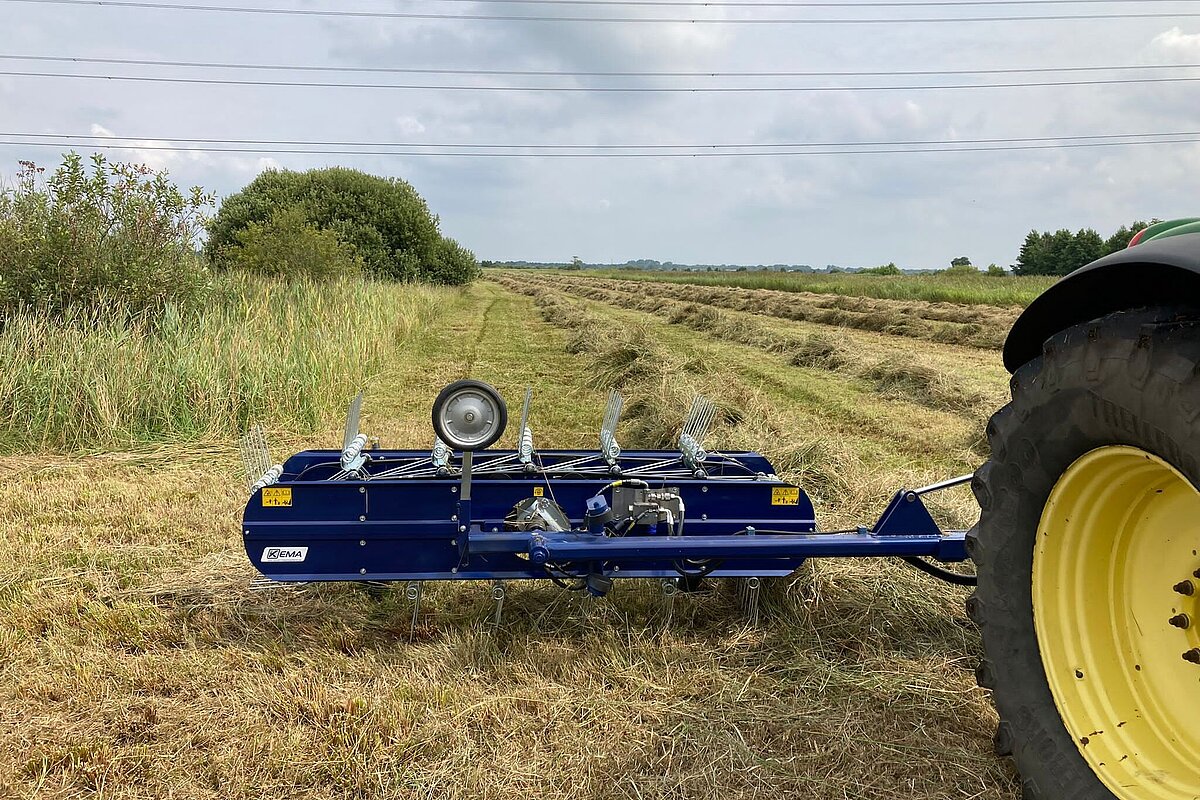 Der Bandrechen von Kema sorgt für schonendes Zusammenführen von Schnittgut. Besonders wichtig für Biodiversitätsflächen, da Insekten und Kleintiere geschont werden.